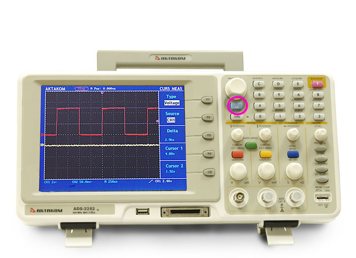 - 20 автоматических измерений: частота, период, среднее значение напряжения, размах, среднеквадратическое значение напряжения за один период, максимальное и минимальное значение напряжения, напряжение вершины и основания прямоугольного импульса, амплитуды напряжения, выброса на вершине и основания прямоугольного импульса, длительность нарастающего и спадающего фронта, длительность положительного и отрицательного импульса, скважность положительного и отрицательного импульса, задержка нарастающего и спадающего фронта.
